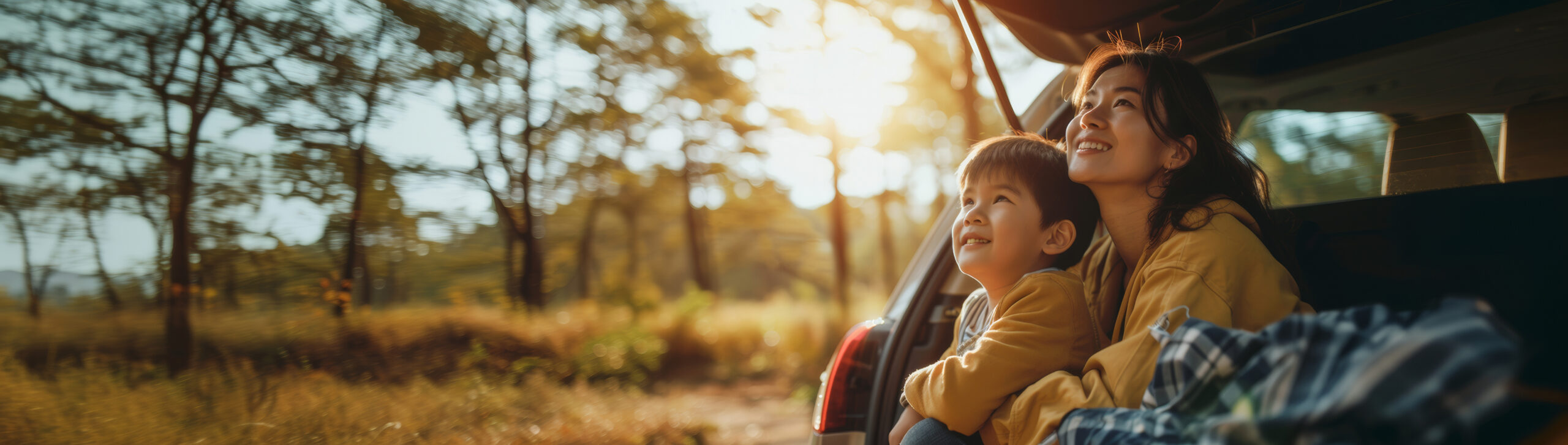 Asian Young mother and child enjoying a sunny car ride in nature, boy gazing out with joy and curiosity
