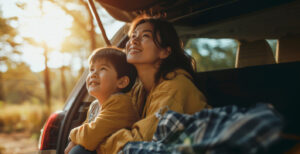 Asian Young mother and child enjoying a sunny car ride in nature, boy gazing out with joy and curiosity